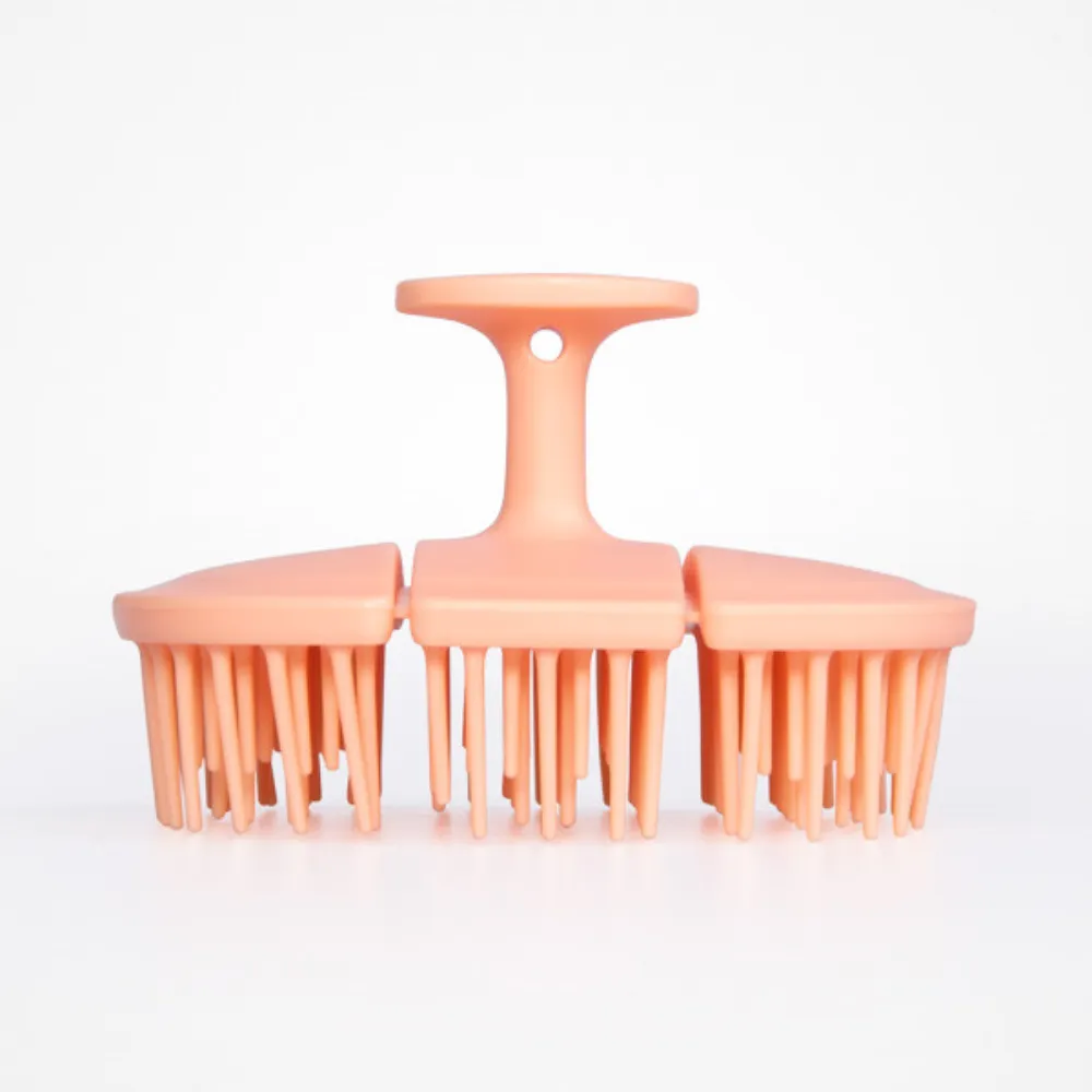 Descubre el Cepillo Bio Flex Fuzz en color melocotón, diseñado con un cabezal flexible de triple pliegue que se adapta a la forma de tu cabeza para un masaje estimulante.